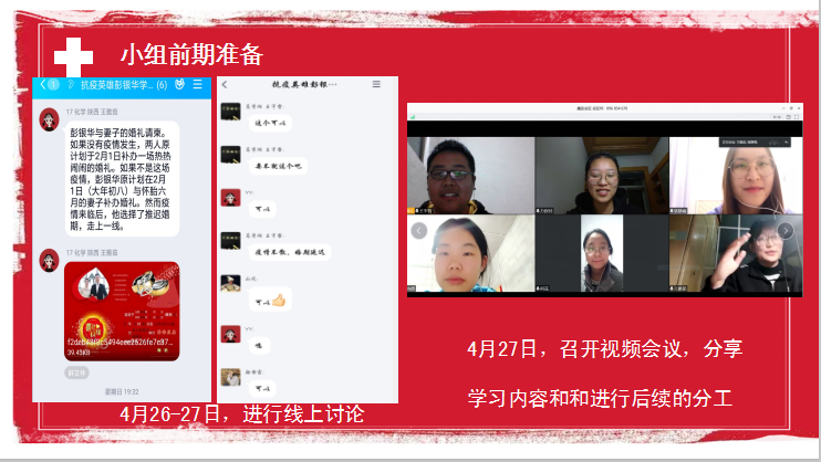 本次学习采用分组讨论的方式,41位党员分为七组,共学习了钟南山、杜富佳、蒋文强、刘智明、彭银华、张定宇、李文亮七位抗疫英雄的故事。每个小组通过材料收集、qq群讨论以及视频会议的方式进行了前期准备,以PPT的形式在党日活动中组织支部全体党员进行了学习。