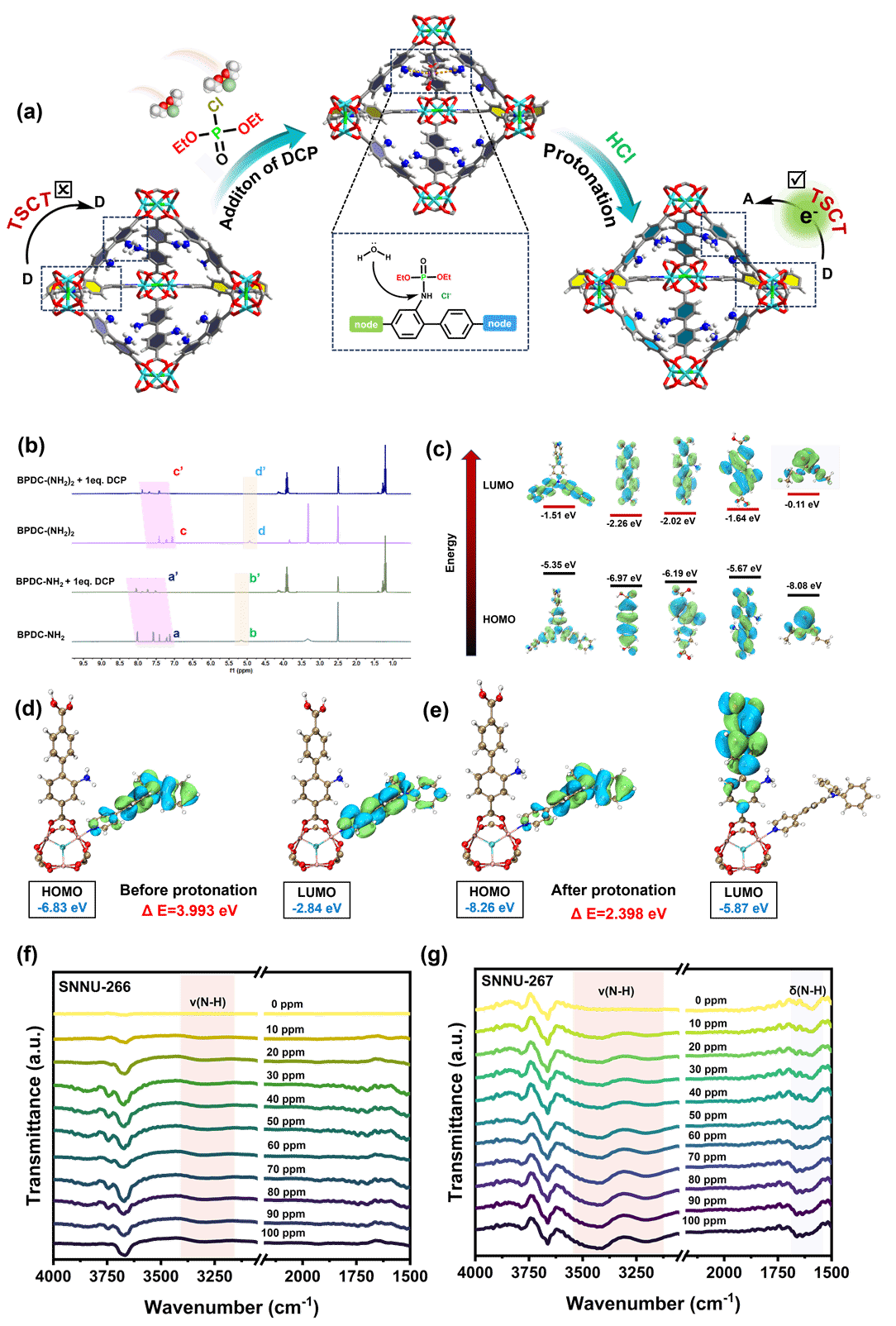 通过空间电荷转移(TSCT)实现动态环境响应型发光是开发高性能荧光传感器的关键策略,但传统小分子TSCT体系需复杂“V/U型”结构设计以保证供体(D)与受体(A)的空间匹配,合成难度大且易受构象柔性影响导致机制混杂;聚合物TSCT平台虽可调控D-A排列,但精准度不足。金属有机框架(MOFs)凭借结晶多孔性与结构可调性,为TSCT调控提供理想载体,但其孔内D-A空间排布的精准控制仍是难题。同时,沙林等神经性毒剂毒性极强,氯磷酸二乙酯(DCP)作为其模拟物,且现有传感器存在检测限高、响应慢或选择性差等问题。因此,开发兼具精准TSCT调控与高效DCP检测能力的MOF材料,成为解决荧光传感机制调控与毒剂检测实用化的双重需求。