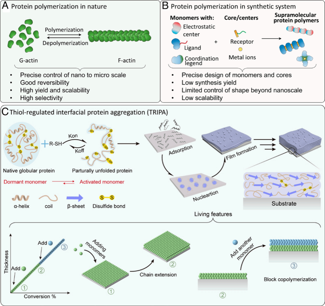 借鉴自然界中蛋白质可控聚集的机制,实现生物聚合物(例如蛋白质)在体外的活性/可控超分子组装是材料设计的长期挑战。该研究提出了基于巯基-二硫键交换反应的蛋白质聚集策略(TRIPA)(图1),其具有典型的活性聚合特征,可在界面处获得厚度可控、具有超高模量且表面平整的蛋白质纳米膜。该策略可实现可逆的单体活化、界面活性生长以及多种蛋白质的嵌段共组装,并能附着在各种材料表面形成结构色涂层。该工作将合成高分子中活性聚合的概念引入到生物大分子领域,为生物分子材料的设计开辟了一条新途径。此外,这种巯基-二硫键交换引发的蛋白质聚集策略具有普适性,有望进一步扩展到其他生物系统,如酶、核酸和细胞,为可控生物界面工程提供多功能应用平台。