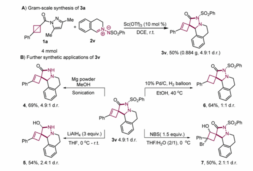 作者报道了一种Sc(OTf)3催化的BCBs与C,N-环状偶氮甲碱亚胺的螺环化反应策略,成功构建了具有重要合成价值的6,7-二氮杂螺[3.4]辛烷骨架。通过克级规模反应和产物的后续转化,证明了这种方法的合成实用性。值得注意的是,这种方法不仅为合成具有潜在药理活性的新型6,7-二氮杂螺[3.4]辛烷衍生物提供了关键技术支撑,更拓展了BCBs类化合物螺环化反应的方法学工具库,为螺环化合物的合成提供新思路。