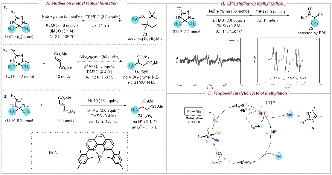 初步的机理研究支持反应经由甲基自由基路径(图4):1)自由基捕获实验使用TEMPO或富马酸二甲酯成功捕获到甲基自由基加合产物;2)电子顺磁共振(EPR)实验使用N-叔丁基-α-苯基硝酮(PBN)作为捕获剂,检测到了自由基加合产物的信号;3)基于Martin团队报道的Ni(I)络合物(Ni-Cl)也能在富马酸二甲酯存在下与TDTP反应生成甲基自由基加合产物。