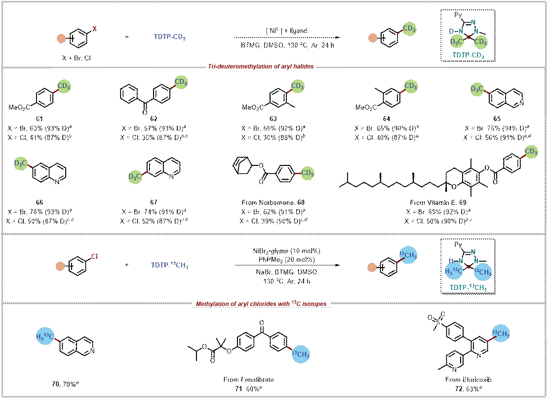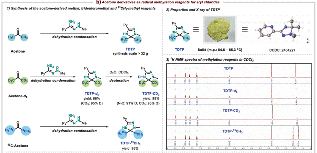 薛东教授团队在这一领域取得重要突破,他们利用丙酮及其同位素衍生物作为起始原料,设计并合成了一系列新型甲基化试剂(TDTP、TDTP-CD3、TDTP-13CH3),成功实现了镍催化下芳基氯的甲基化、氚代甲基化和13C-甲基化。该工作无需额外添加氧化还原剂、光或电化学条件,且展现出优异的官能团耐受性、底物普适性以及良好的规模化制备潜力,为药物发现与复杂分子合成提供了强大工具。