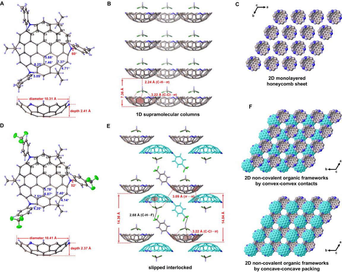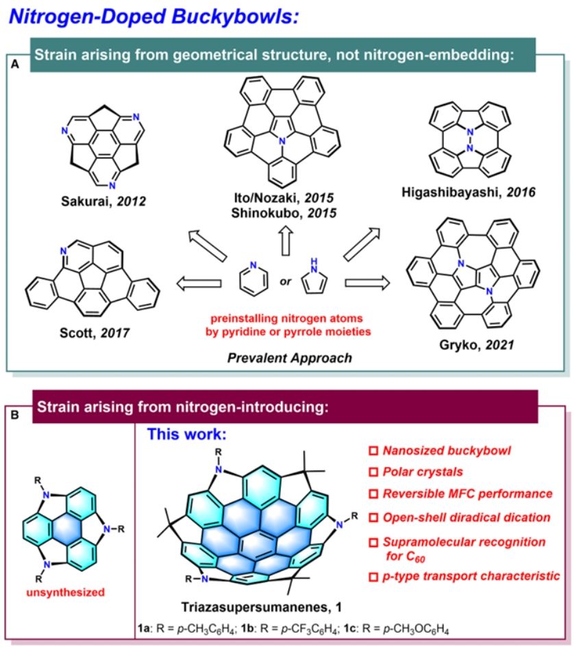 弯曲纳米石墨烯(curved NGs)是一类扭曲的大尺寸多环芳烃,因其独特的几何形状和迷人的物理化学性质,近年来在化学科学和材料科学等领域引起了广泛关注。其中具有正曲率的巴基碗(buckybowls)或π-碗,能够作为一种极具潜力的砌块单元,被广泛用于构建有机发光二极管(OLED)、有机场效应晶体管(OFET)和有机太阳能电池(OSC)等电子器件。此外,将杂原子(如氮)引入这些碗状分子的π-共轭骨架中,可以显著调控分子的固态堆积、轨道能级以及分子内的电子分布,赋予其独特的性质、性能。尽管氮掺杂巴基碗的研究取得了一些进展,但大多数工作都是在前驱体阶段通过引入吡啶或吡咯单元预置氮原子,再缝合分子骨架形成碗状结构;然而,在最后一步通过引入吡咯环诱导曲率将平面分子弯曲成碗状结构的例子依然十分罕见。