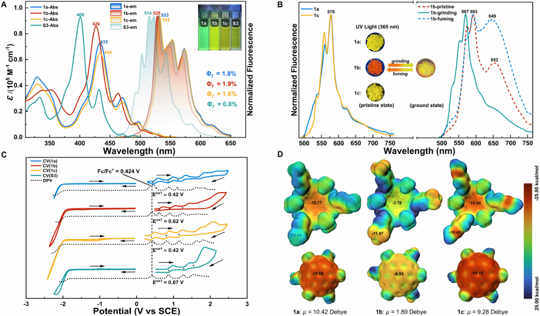 图4 1a, 1b和1c的光电性质和静电势图