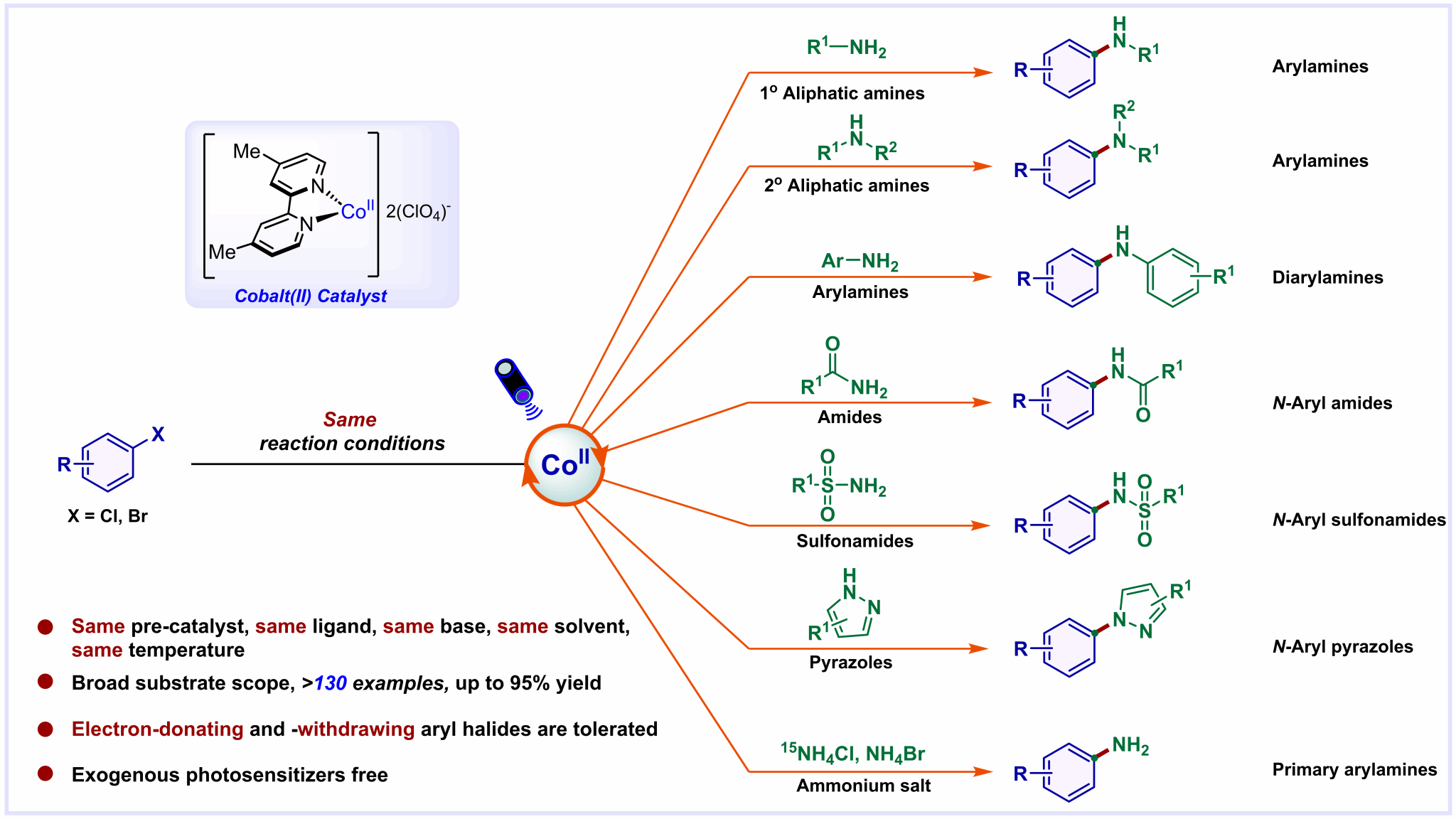 过渡金属催化的C-N偶联反应为芳胺及其衍生物的合成提供了重要方法,已成为药物合成领域最常用的20个反应之一。然而,默克公司(Merck)的研究表明:基于∼10000个实例的数据分析,C-N偶联反应的失败率仍然高达 35%。究其原因,目前广泛使用的过渡金属催化剂体系在很大程度上依赖于各种特定配体、前催化剂的设计、合成,以及针对不同类型的含氮底物开展的催化剂筛选和反应条件的逐一优化,导致缺乏通用性C−N偶联反应催化剂体系。为突破这一瓶颈,基于机器学习、人工智能与高通量实验(HTE)结合筛选反应条件的策略近年来得到了快速发展。考虑到C-N 偶联反应在合成化学中的重要性,开发通用性 C-N 偶联催化剂新体系(使用相同的前催化剂、配体、溶剂、碱和温度)为C-N偶联反应的发展提供了新的策略。钴(Co)是一种低毒且储量丰富的金属,由于其高的催化活性,钴催化剂被视为贵金属催化剂的理想替代品。Co催化剂在C-C键交叉偶联反应领域已经得到了广泛的应用,但是在构筑C-N键方面的应用还十分有限。小说网