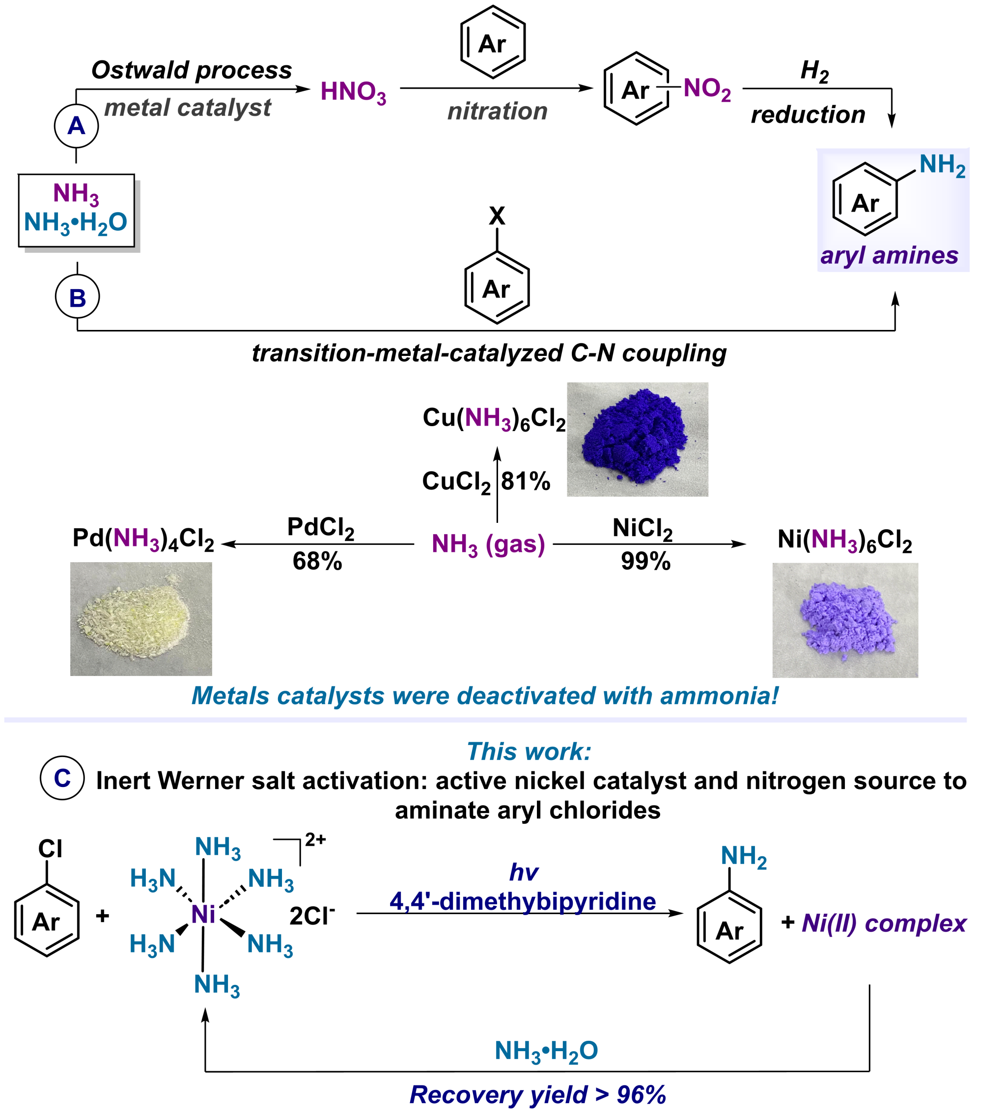 氨(NH3)是化肥工业和基本有机化工的主要原料。通过Haber-Bosch工艺,其全球年产量超过1.82亿吨。将NH3转化为高附加值精细化学品是合成化学研究的前沿领域。以苯胺及其衍生物为代表的芳基伯胺是医药、农用化学品、染料、功能材料和聚合物中的重要中间体。苯胺及其衍生物目前在工业上是通过硝化和加氢还原过程来制备。该合成路径使用HNO3作为氮源,混酸作为硝化试剂,存在产生大量废酸,后处理困难,反应选择性差等问题。此外,HNO3是由氨经过高能耗的Ostwald工艺制备的。因此,利用廉价易得的氨作为氮源,发展本质安全的芳胺及其衍生物合成方法是亟待解决的重要科学问题。