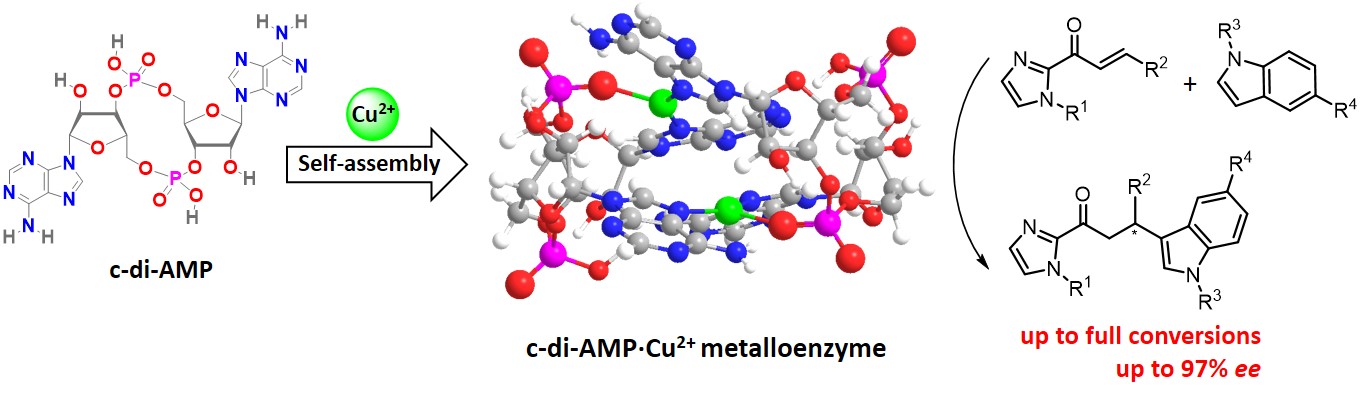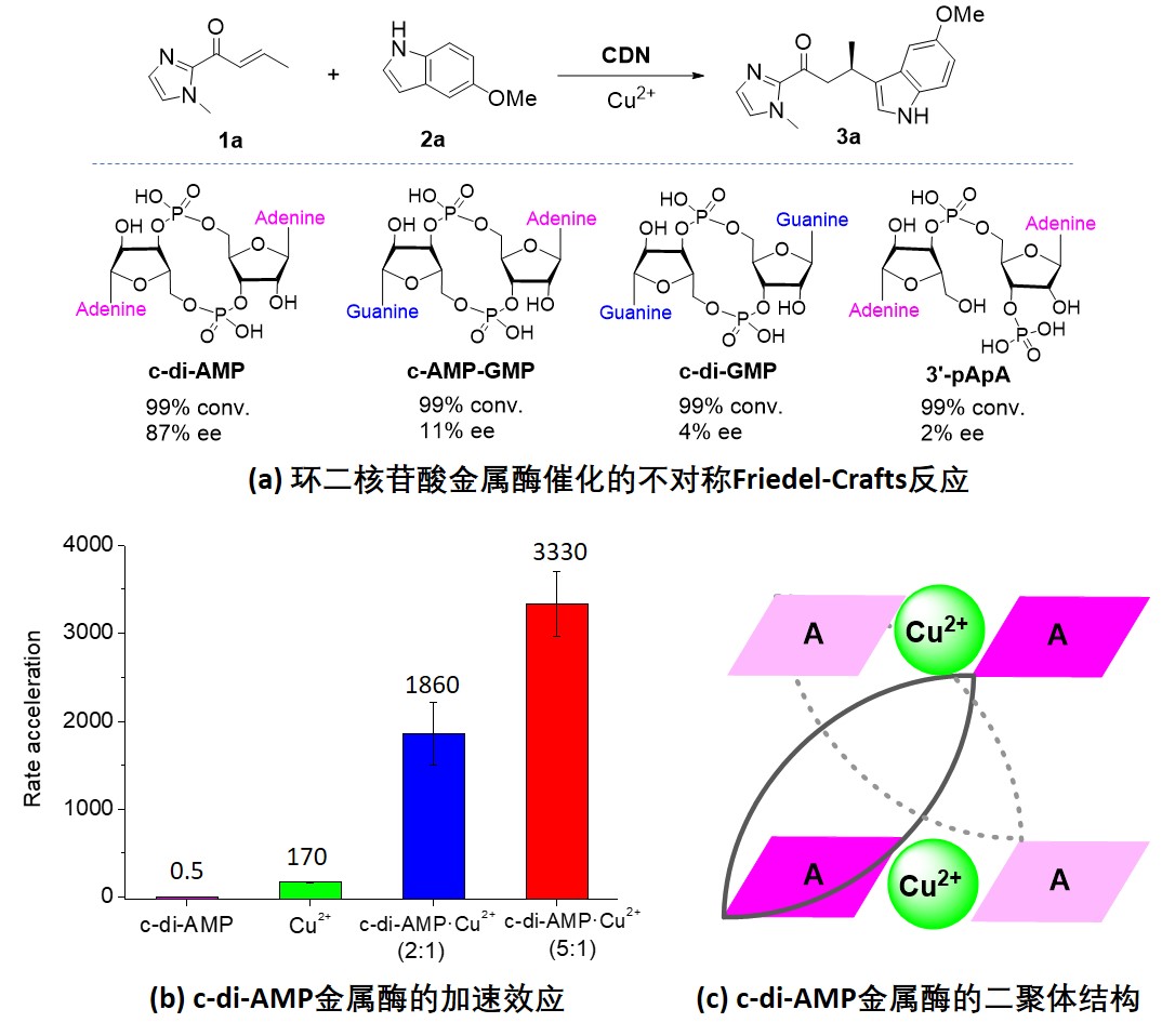 CDNs的催化功能研究尚未见报道。CDNs在不同的条件下可以形成多种空间构型,这为发展基于CDN的人工RNA金属酶提供了手性骨架。本课题组在研究中发现一种含有两个腺苷酸的环二核苷酸c-di-AMP和Cu2+离子能有效组装成人工RNA金属酶,对水相中的不对称Friedel-Crafts反应表现出高的反应活性和优异的手性选择性,最高ee值达到97%。相比空白反应,人工c-di-AMP金属酶提高反应速率3000倍以上。与单独铜离子相比,人工c-di-AMP金属酶也可以提高反应速率近20倍。控制实验表明,人工CDN金属酶中的两个腺苷酸和12元环结构对于CDN金属酶的手性催化性能至关重要。光谱表征和DFT计算表明,两分子c-di-AMP和Cu2+离子组装成二聚体结构,其中两个来自不同c-di-AMP的一个A碱基形成平面结构。Cu2+离子位于A-A平面中间,通过两个A碱基的N7位和临近的磷酸基的一个氧原子相互作用形成人工c-di-AMP金属酶。本研究表明CDNs可以作为一类稳定的手性骨架用于组装人工RNA金属酶,未来有望解决更多类型的水相反应。另外,CDNs是一类天然环状RNA分子,本研究为发掘CDNs在自然界中的潜在催化功能提供了研究依据。
