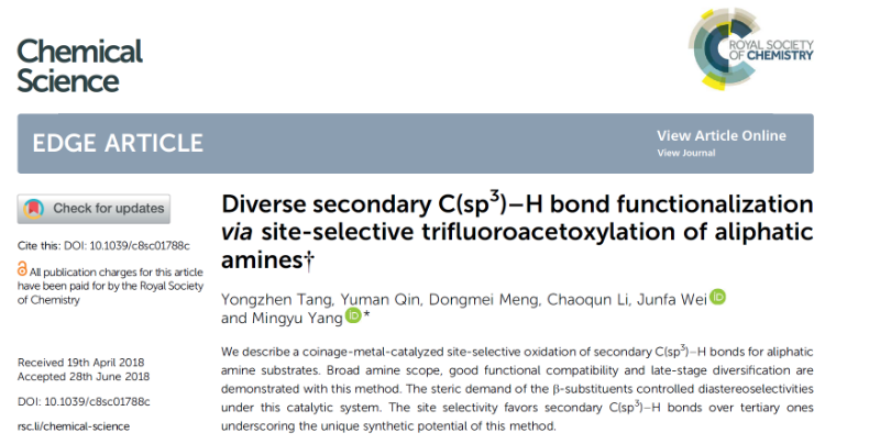 全文详见:Yongzhen Tang, Yuman Qin, Dongmei Meng, Chaoqun Li, Junfa Wei, Mingyu Yang *; Diverse secondary C(sp3)–H bond functionalization via site-selective trifluoroacetoxylation of aliphatic amines; Chem. Sci. 2018, asap. DOI: 10.1039/c8sc01788c(//pubs.rsc.org/en/content/articlepdf/2018/sc/c8sc01788c?page=search)