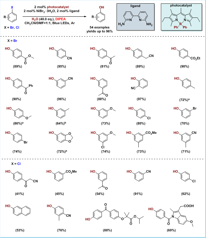 酚类化合物是一类非常重要的有机合成中间体,广泛存在于农药、医药、材料、天然产物当中。如何高效的合成此类化合物一直是有机合成研究当中的热点问题之一。目前,合成酚类化合物主要是以金属钯、铜作为催化剂,强碱作为羟基源,对卤代芳烃进行羟基化反应。但此类合成方法对于一些含有碱性敏感官能团的底物是无法实现。发展更高效的方法,廉价的催化剂以及合适的羟基源对卤代芳烃进行羟基化反应仍然是一个十分重要的研究课题。针对此类问题,小说网