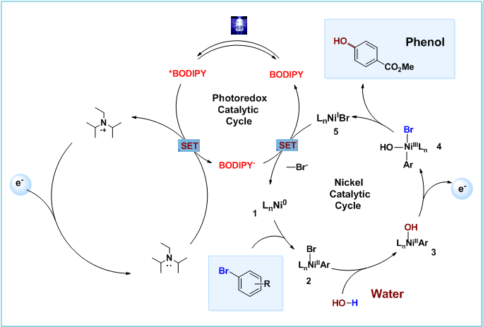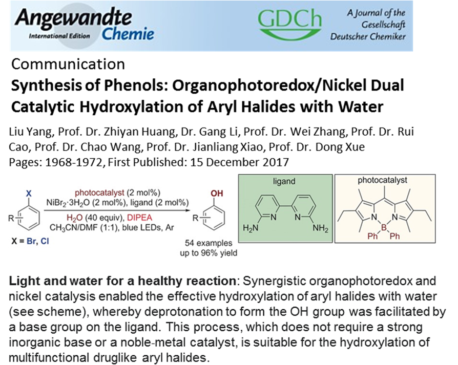 Synthesis of Phenols: Organophotoredox/Ni Dual Catalytic Hydroxylation of Aryl Halides with Water,Liu Yang, Zhiyan Huang, Gang Li, Wei Zhang, Rui Cao, Chao Wang, Jianliang Xiao, and Dong Xue*,Angew. Chem., Int. Ed. 2018, 57, 1968-1972。(全文见//doi.org/10.1002/anie.201710698)