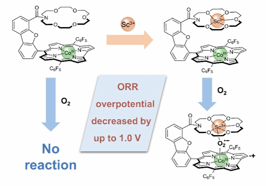 近日,曹睿教授团队报道了一种通过第二配位层悬挂Sc3+离子的CoIII咔咯来促进O2的活化,从而显著增强ORR电催化性能。通过引入Sc3+离子,该CoIII咔咯分子催化ORR的过电位在乙腈溶液中降低了1.0 V,在0.5 M H2SO4溶液中降低了170 mV。并且,第二配位层含有Sc3+的CoIII咔咯分子在0.5 M H2SO4溶液中ORR的半波电位为0.78 V (vs RHE),电子转移数为3.87。实验结果表明,悬挂的Sc3+促进了O2在CoIII咔咯分子上结合与活化,生成了CoIII-超氧-Sc3+咔咯阳离子自由基并通过多种光谱表征对该结构进行了验证,理论计算结果表明,氢氧根的离去进一步协助了O-O键的断裂过程。相关研究成果以“Promoted O2 Activation at a CoIII Center for Significantly Improved Electrocatalytic Oxygen Reduction Reaction”为题发表于Journal of the American Chemical Society期刊上,论文的通讯作者为曹睿教授、廖荣臻教授(华中科技大学)、张林娟教授(中科院上海应用物理研究所)和龙冉教授(中国科学技术大学),第一作者为李夏亮副研究员、靳晓童(博士后)和曹宇辰博士(华中科技大学)。论文链接://pubs.acs.org/10.1021/jacs.5c14593