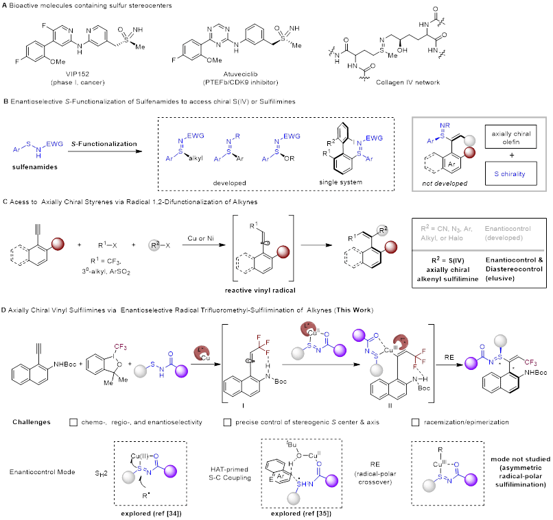 近年来,以次磺酰胺为前体的不对称硫官能化反应逐渐发展成为构建手性硫亚胺的有力替代途径。尽管如此,目前报道的方法大多仍局限于双电子离子型机理。相比之下,自由基化学凭借其反应条件温和、官能团兼容性好等优势,已成为现代有机合成中构筑功能分子、设计高分子材料及开发创新药物的重要工具。值得关注的是,2025年李兴伟/肖纪超团队通过氢原子转移(HAT)引发的外球自由基-自由基偶联,实现了(杂)芳烃的C-H键直接硫亚胺化(J. Am. Chem. Soc. 2025, 147, 38931–38941)。近期,刘心元、顾强帅、董哲与洪鑫团队也报道了通过对映选择性SH2自由基偶联,实现烷基卤化物与次磺酰胺的不对称偶联(Nat. Chem. 2025, 18, 142-151)。尽管取得了这些重大进展,但烯基-芳基或烯基-烷基的硫亚胺的合成仍然存在挑战。此外,多重手性硫胺的合成仍有许多问题尚未解决,尤其是轴手性硫胺的的研究仅有一例报道。基于团队长期以来致力于通过炔烃官能团化合成轴手性烯烃的启发,通过芳基炔烃与次磺酰胺的自由基接力实现了轴手性乙烯基硫亚胺的构建。
